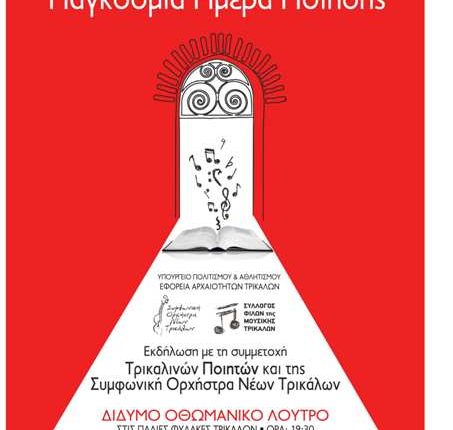 Την ημέρα αυτή θα τιμήσουν η Εφορεία Αρχαιοτήτων Τρικάλων και o Σύλλογος Φίλων της Μουσικής Τρικάλων την Πέμπτη 21 Μαρτίου και ώρα 20:00, συνδιοργανώνοντας μια εκδήλωση «συγκερασμού» ώριμης ποίησης και νεανικής μουσικής προσφοράς στο Δίδυμο Οθωμανικό Λουτρό, στο ισόγειο των παλιών φυλακών Τρικάλων, έναν χώρο φορτισμένο από την ιστορία.