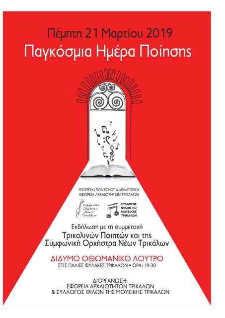 Την ημέρα αυτή θα τιμήσουν η Εφορεία Αρχαιοτήτων Τρικάλων και o Σύλλογος Φίλων της Μουσικής Τρικάλων την Πέμπτη 21 Μαρτίου και ώρα 20:00, συνδιοργανώνοντας μια εκδήλωση «συγκερασμού» ώριμης ποίησης και νεανικής μουσικής προσφοράς στο Δίδυμο Οθωμανικό Λουτρό, στο ισόγειο των παλιών φυλακών Τρικάλων, έναν χώρο φορτισμένο από την ιστορία.