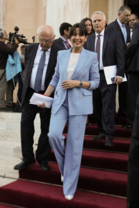 Δίπλα της, σε όλη τη διάρκεια της ορκωμοσίας, ο σύζυγός της επίσης βουλευτής του ΣΥΡΙΖΑ, Γιάννης Ραγκούσης.