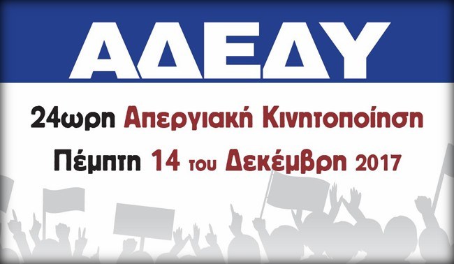 Στις 14 του Δεκέμβρη οι εργαζόμενοι στο Δημόσιο και στον Ιδιωτικό Τομέα απεργούμε για να διεκδικήσουμε τα αυτονόητα δικαιώματά μας και να σταματήσουμε τη λαίλαπα των μνημονιακών μέτρων, που και η σημερινή Κυβέρνηση εφαρμόζει.