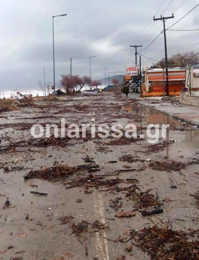 Μαζί με αυτά, διάφορα φερτά υλικά, ακόμη και μία βάρκα (!) όπως θα δείτε στην παρακάτω φωτογραφία του onlarissa.gr, βρέθηκαν στο οδόστρωμα.