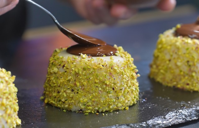 - Ξεφορμάρουμε και ρολάρουμε προσεκτικά τα γλυκάκια στο θρυμματισμένο φιστίκι Αιγίνης.