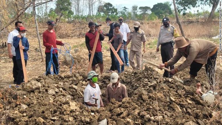 Οι χωρικοί που αρνούνται να φορέσουν μάσκες εξαναγκάζονται από τις τοπικές αρχές να σκάβουν τάφους για τα θύματα κοροναϊού σε μια αγροτική περιοχή της Ινδονησίας. Οι αρχές ελπίζουν ότι η χειρωνακτική εργασία και η συμπόνια θα αναγκάσει μεγαλύτερο μέρος του πληθυσμού να κάνει το καθήκον του για να ανακόψει την πανδημία.