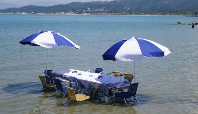 Μία ταβέρνα στην Κέρκυρα προσαρμόζεται στις ανάγκες του κόσμου και βρίσκει τη λύση για τους μεγάλους καύσωνες που βρίσκονται προ των πυλών: Τοποθέτησε τραπέζι κυριολεκτικά μέσα στη θάλασσα!