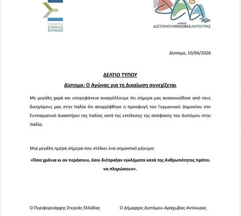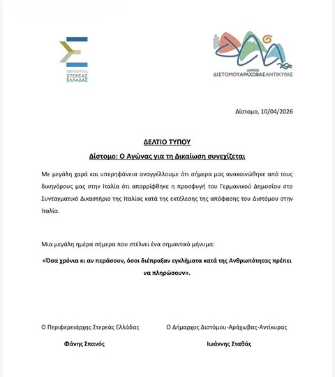 Σύμφωνα με όσα έγιναν γνωστά τη Μεγάλη Παρασκευή (10.04.2026) από την περιφέρεια Στερεάς Ελλάδας και τον δήμο Διστόμου-Αράχοβας-Αντίκυρας, η εξέλιξη αυτή ανοίγει τον δρόμο την καταβολή αποζημιώσεων στις οικογένειες των θυμάτων της σφαγής του Διστόμου, εκτός εάν η Γερμανία επιλέξει νέα προσφυγή στο Διεθνές Δικαστήριο της Χάγης ή η ιταλική κυβέρνηση προχωρήσει σε νομοθετική παρέμβαση.