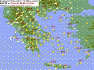 Σύμφωνα με το αυτοματοποιημένο προγνωστικό σύστημα του meteo.gr του Αστεροσκοπείου Αθηνών οι θερμοκρασίες θα είναι υψηλές και την Τρίτη. Ενδεικτικά, στην Αθήνα μπορεί να φτάσει τους 32 βαθμούς Κελσίου.
