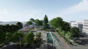 – Στη βόρεια πλευρά της πλατείας διαμορφώνονται επάλληλα πλατώματα από σκυρόδεμα που συνοδεύονται από μικρές υδατοδεξαμενές, δημιουργώντας μια ατμοσφαιρική αλλά και φιλότεχνη είσοδο αφού εκεί προβλέπεται η τοποθέτηση γλυπτών.