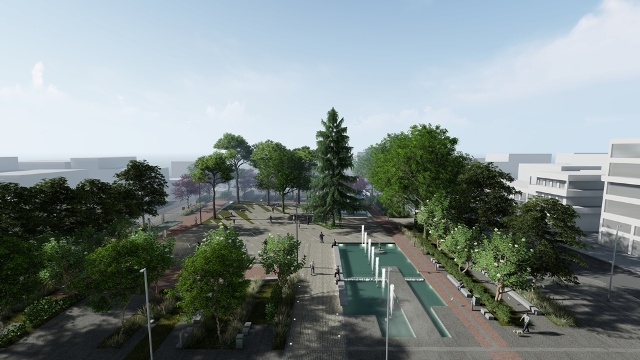 – Στη βόρεια πλευρά της πλατείας διαμορφώνονται επάλληλα πλατώματα από σκυρόδεμα που συνοδεύονται από μικρές υδατοδεξαμενές, δημιουργώντας μια ατμοσφαιρική αλλά και φιλότεχνη είσοδο αφού εκεί προβλέπεται η τοποθέτηση γλυπτών.