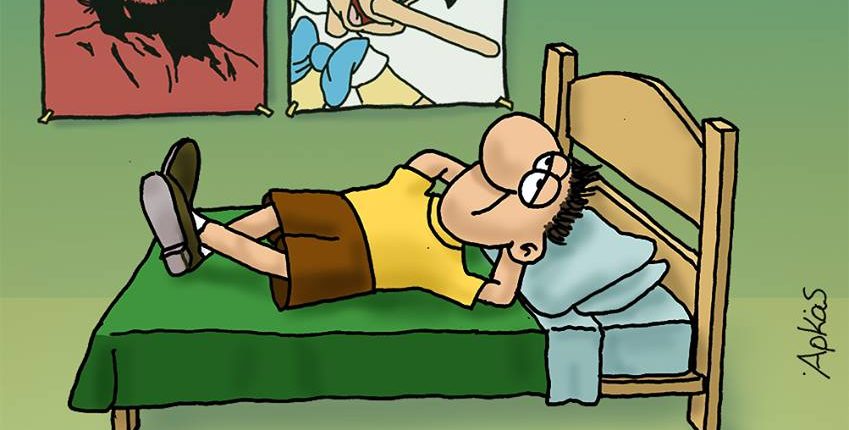 Στο τελευταίο του σκίτσο ένα παιδί να είναι ξαπλωμένο στο κρεβάτι του, και από πάνω δύο αφίσες: μια του Τσε Γκεβάρα και μία του Πινόκιο. Και είναι προφανές που στοχεύει.