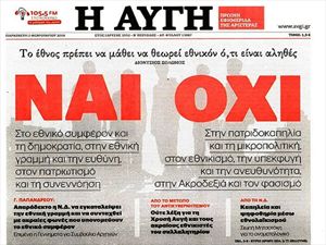 Πάντως το πρωτοσέλιδο της Αυγής έχει ξεκάθαρα δημοψηφισματικό χαρακτήρα καθώς είναι χωρισμένο σε «Ναι» και «Οχι».
