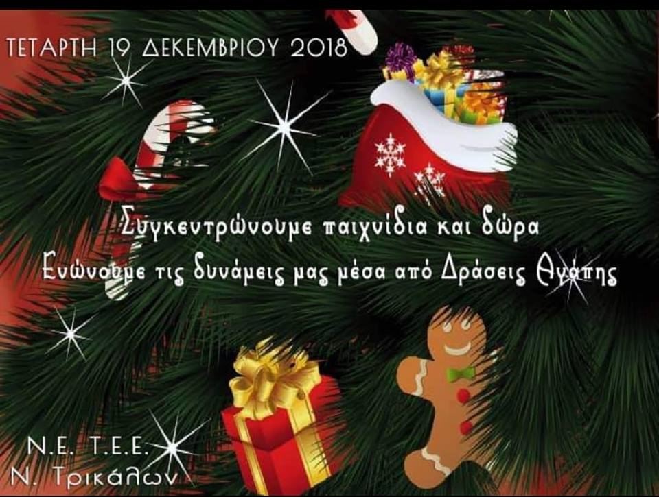 Την Τετάρτη 19 Δεκεμβρίου 2018 από τις 17:00 έως τις 20:00 στα γραφεία της Νομαρχιακής Επιτροπής Τ.Ε.Ε. Τρικάλων επί της οδού Καποδιστρίου 6 στον 1ο όροφο υποδεχόμαστε συναδέλφους και φίλους με τα παιδιά τους για να ανταλλάξουμε ευχές και να ενώσουμε τις δυνάμεις μας με τον Δήμο Τρικκαίων.