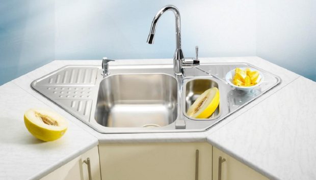 Βάλτε τον νεροχύτη Μπορεί οι γωνιές να ενδείκνυνται για την προσθήκη επιπλέον αποθηκευτικού χώρου, δεν είναι ωστόσο η μόνη επιλογή. Οι γωνίες της κουζίνας είναι το ιδανικό σημείο για να δοκιμάσετε μια πρωτότυπη παρέμβαση: βάλτε εκεί τον νεροχύτη σας. Η προσέγγιση αυτή θα σας δώσει άνεση καθώς θα υπάρχει χώρος δεξιά και αριστερά του νεροχύτη για το στέγνωμα των πιάτων. Επίσης θα έχετε χώρο στο πίσω μέρος του νεροχύτη για να τοποθετήσετε το υγρό πιάτων και τα σφουγγάρια σας. Τέλος, ο χώρος κάτω από τον νεροχύτη σας είναι ιδανικός για να αποθηκεύσετε τα μαγειρικά σας σκεύη ή τα καθαριστικά σας προϊόντα.