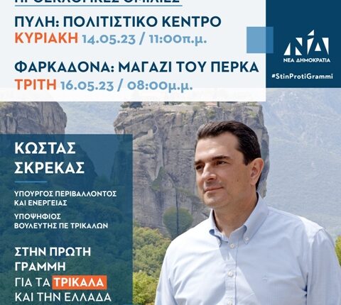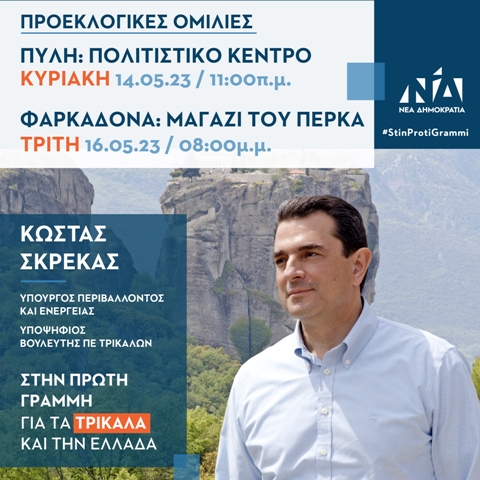 O Υπουργός Περιβάλλοντος και Ενέργειας και υποψήφιος βουλευτής Τρικάλων, Κώστας Σκρέκας, θα απευθύνει ομιλία την Κυριακή 14 Μαΐου 2023, στις 11:00 το πρωί, στο Πολιτιστικό Κέντρο Πύλης και την Τρίτη 16 Μαΐου, στις 8:00 μ.μ., στη Φαρκαδόνα, στο Μαγαζί του Πέρκα.