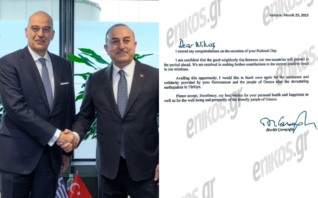 Συγκεκριμένα στην επιστολή του ο Τούρκος Υπουργός Εξωτερικών, εκτός από τις ευχές για την 25η Μαρτίου, σημειώνει πως είναι βέβαιος ότι οι σχέσεις καλής γειτονίας οι οποίες υφίστανται αυτή τη στιγμή μεταξύ Ελλάδος και Τουρκίας θα παγιωθούν στο μέλλον. Παράλληλα, δηλώνει αποφασισμένος να συμβάλει περαιτέρω στην τωρινή θετική δυναμική η οποία επικρατεί στις διμερείς σχέσεις Ελλάδος και Τουρκίας.