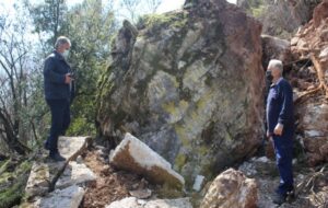 Συγκεκριμένα ο κ. Χατζής με τον κ. Γεωργομάνο επισκέφθηκαν τον χώρο της μεγάλης ζημιάς στο Συνοικισμό (ΠΑΛΑΙΟΜΥΛΟΣ) Καλογήρων , όπου ένας τεράστιος βράχος έφραξε τον αγροτικό δρόμο που οδηγούσε σε κατοικίες και ποιμνιοστάσιο που διατηρεί εκεί κτηνοτρόφος του Χωριού, με αποτέλεσμα να διακοπεί η επικοινωνία.