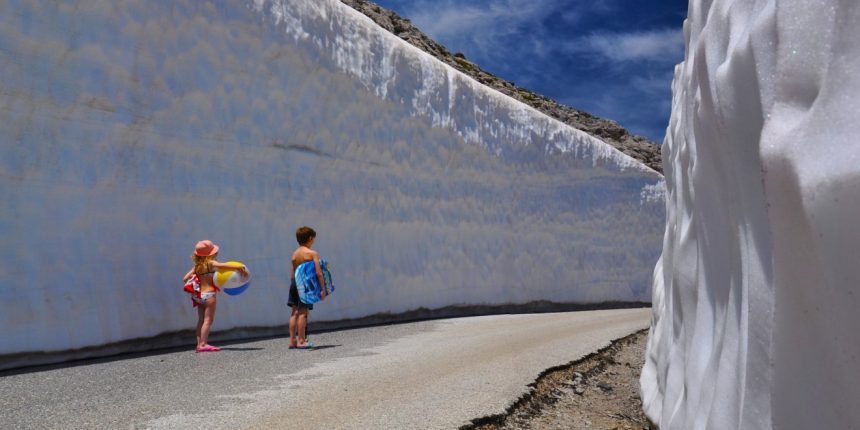 Τα παιδιά με εξοπλισμό παραλίας ανάμεσα στα χιόνια, στον δρόμο για Σκίνακα, αναζητούν την παραλία κατά τη χθεσινή καυτή ημέρα του Μαΐου!