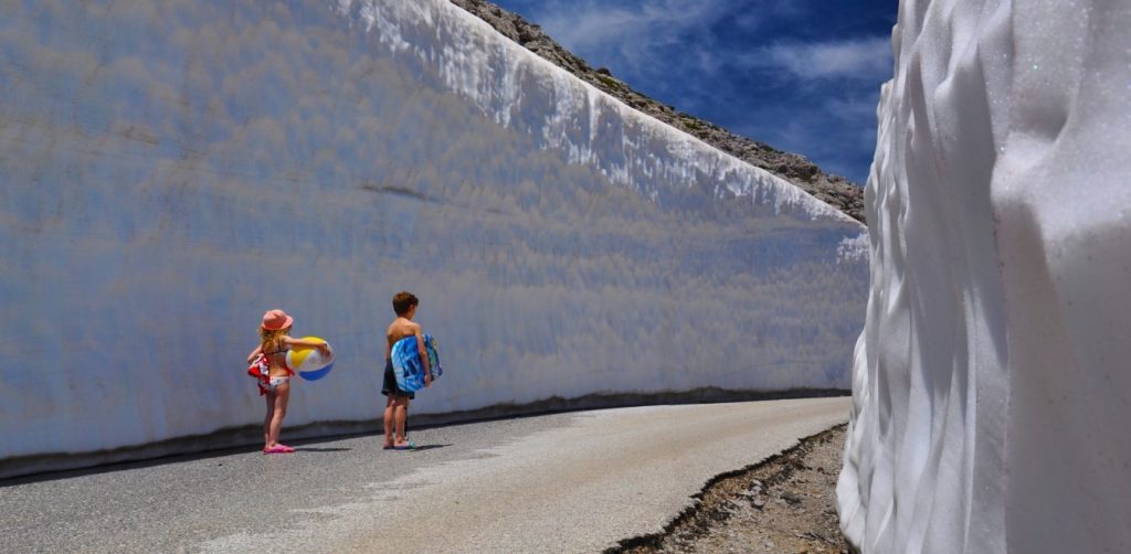 Τα παιδιά με εξοπλισμό παραλίας ανάμεσα στα χιόνια, στον δρόμο για Σκίνακα, αναζητούν την παραλία κατά τη χθεσινή καυτή ημέρα του Μαΐου!