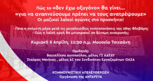 Πώς το «δεν έχω οξυγόνο» θα γίνει… «για να αναπνεύσουμε πρέπει να τους ανατρέψουμε» Οι μαζικοί λαϊκοί αγώνες στο προσκήνιο! Ποια η επόμενη μέρα μετά τις μεγαλειώδεις κινητοποιήσεις της 28ης Φλεβάρη; Πώς η λαϊκή οργή θα μετατραπεί σε δύναμη ανατροπής; Κυριακή 6 Απρίλη, 11:30 π.μ. Μουσείο Τσιτσάνη Ομιλητές: Βαγγελίτσα Δινοπούλου, μέλος ΓΣ ...