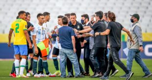 Η αναμέτρηση της Βραζιλίας με την Αργεντινή διεκόπη οριστικά έπειτα από την εισβολή αστυνομικών δυνάμεων, προκειμένου να συλλάβουν τέσσερις Αργεντινούς διεθνείς που ταξίδεψαν από την Αγγλία. Συγκεκριμένα, η αστυνομία της Βραζιλίας έκανε έφοδο στον αγωνιστικό χώρο της “Αρένα Κορίνθιανς” του Σάο Πάουλο, κατά τη διάρκεια της αναμέτρησης της χώρας με την Αργεντινή για τα προκριματικά ...