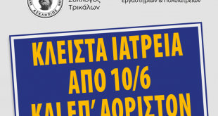 Διάβασε περισσότερα »Ξεσηκώνονται οι Τρικαλινοί γιατροί. Κλειστά επ’ αόριστον τα μικροβιολογικά-βιοπαθολογικά ιατρεία