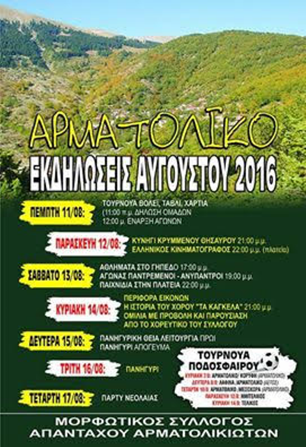 Πολλές και ποικίλες εκδηλώσεις διοργανώνει ο Μορφωτικός Σύλλογος Απανταχού Αρματολικιωτών την περίοδο του Δεκαπενταύγουστου Το πρόγραμμα των εκδηλώσεων έχει ως εξής: Πέμπτη 11 Αυγούστου ΤΟΥΡΝΟΥΑ ΒΟΛΕΥ, ΤΑΒΛΙ, ΧΑΡΤΙΑ 1. Δήλωση Ομάδων (ώρα11:00΄) 2. Έναρξη αγώνων (ώρα 12:00΄) Παρασκευή 12 Αυγούστου 1. Κυνήγι κρυμμένου Θησαυρού (ώρα 21:00΄) 2. Ελληνικός κινηματογράφος (ώρα ...