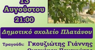 Ο Μορφωτικός Σύλλογος Απανταχού Πλατανιωτών σας προσκαλεί στο 1ο αντάμωμα που διοργανώνει το Σάββατο 13 Αυγούστου σε ένα καταπράσινο περιβάλλον, στο δημοτικό σχολείο Πλατάνου. Θα τραγουδήσουν ο Γιάννης Γκουζιώτης και ο Παναγιώτης Οικονόμου τους οποίους θα συνοδεύουν στο κλαρίνο ο Κώστας Βακουφτσής, στο βιολί ο Μιλτιάδης Παρασκευάς, στην κιθάρα ο ...