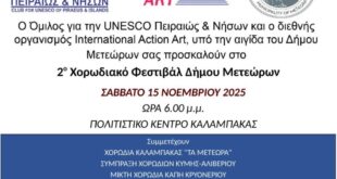 Ο Όμιλος για την UNESCO Πειραιώς & Νήσων και ο διεθνής οργανισμός International Action Art, υπό την αιγίδα του Δήμου Μετεώρων, διοργανώνουν το 2 ο Χορωδιακό Φεστιβάλ Δήμου Μετεώρων, το Σάββατο 15 Νοεμβρίου 2025 και ώρα 6:00 μ.μ., στο Πολιτιστικό Κέντρο Καλαμπάκας. Η μεγάλη αυτή μουσική συνάντηση φέρνει κοντά χορωδίες ...