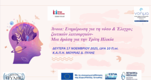 Τα στελέχη του Κέντρου Κοινότητας Δήμου Πύλης, σε συνεργασία με το εξειδικευμένο προσωπικό του Κέντρου Ημέρας και Κινητής Μονάδας για άτομα με άνοια «Νόημα», σας προσκαλούν σε ενημερωτική εκδήλωση και έλεγχο ζωτικών λειτουργιών με θέμα: «Άνοια: Ενημέρωση για τη νόσο & Έλεγχος Ζωτικών Λειτουργιών – Μια Δράση για την Τρίτη ...