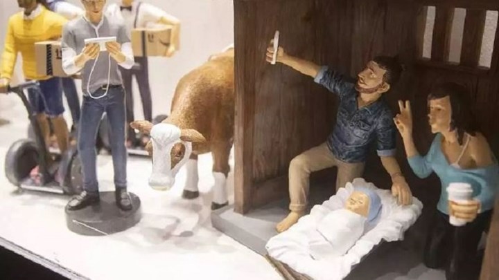 Δεν πρόκειται για τη σιωπηλή Άγια Νύχτα. Ο Ιωσήφ μαζεύει την οικογένεια για την πρώτη χριστουγεννιάτικη σέλφι. Ένας απ’ τους βοσκούς περιγράφει στο snapchat την όλη σκηνή. Η μητέρα του Ιησού κρατά κούπα καφέ από Starbucks. Μια γελάδα μασουλάει βοσκή χωρίς γλουτένη. Οι Τρεις Μάγοι έχουν αντικαταστήσει τα δώρα – λιβάνι, χρυσός και σμύρνα – με prime boxes της Amazon. Κανείς από τους χαρακτήρες δεν έχει το βλέμμα του στραμμένο στο θείο βρέφος.