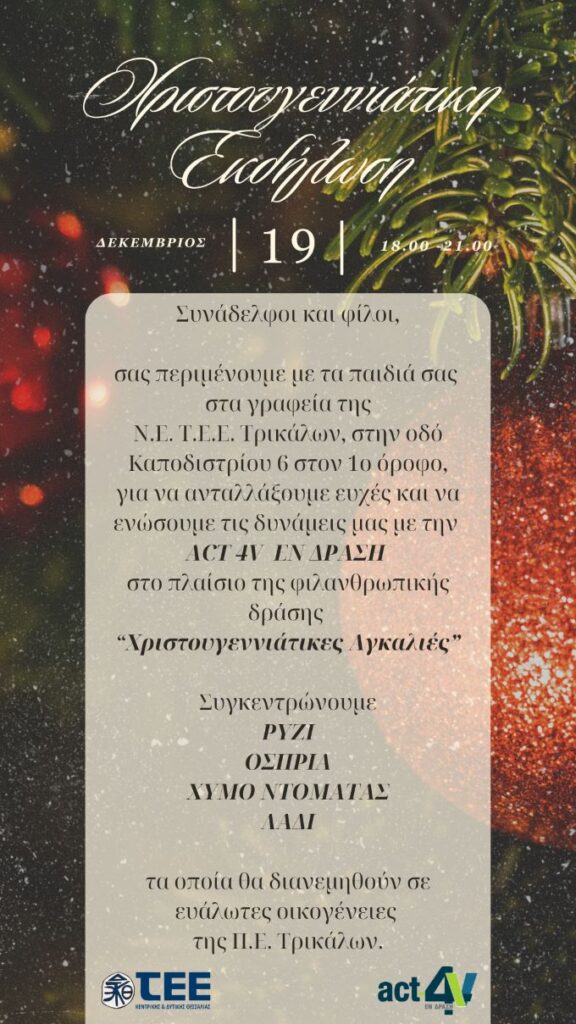 Tην καθιερωμένη Χριστουγεννιάτικη Φιλανθρωπική Εκδήλωση πραγματοποιεί  το ΤΕΕ την Πέμπτη 19/12/2024 το απόγευμα στα γραφεία στον 1ο όροφο επί της οδού Καποδιστρίου 6.