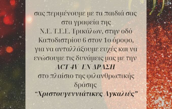 Σε συνέργεια με την ACT4V EN ΔΡΑΣΗ και την φιλανθρωπική δράση «Χριστουγεννιάτικες Αγκαλιές» συγκεντρώνουμε Ρύζι-Όσπρια-Χυμό Ντομάτας-Λάδι τα οποία θα διατεθούν σε ευάλωτες οικογένειες της Π.Ε. Τρικάλων.
