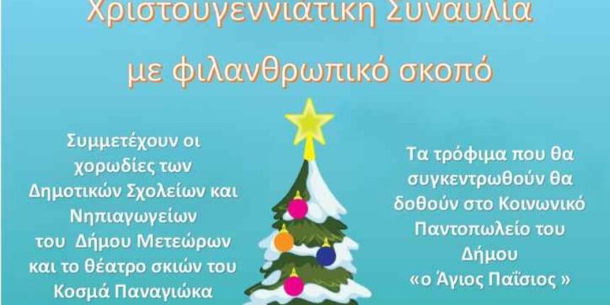 Ο Δήμος Μετεώρων, σε συνεργασία με την Ιερά Μητρόπολη Σταγών και Μετεώρων και τη Διεύθυνση Πρωτοβάθμιας Εκπαίδευσης Τρικάλων, σας προσκαλούν στη Χριστουγεννιάτικη Συναυλία με φιλανθρωπικό σκοπό.