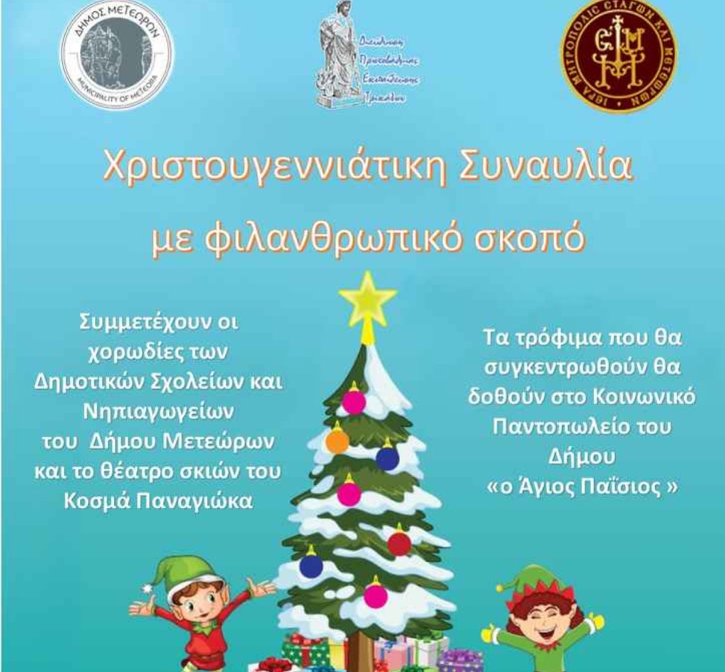 Ο Δήμος Μετεώρων, σε συνεργασία με την Ιερά Μητρόπολη Σταγών και Μετεώρων και τη Διεύθυνση Πρωτοβάθμιας Εκπαίδευσης Τρικάλων, σας προσκαλούν στη Χριστουγεννιάτικη Συναυλία με φιλανθρωπικό σκοπό.