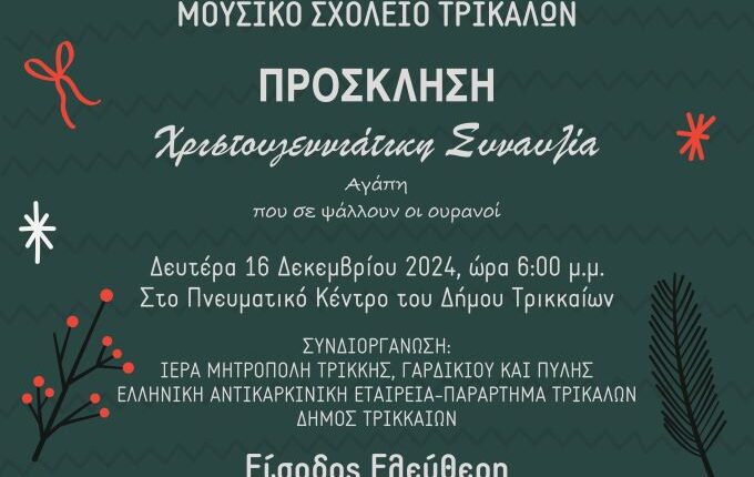 Το Μουσικό Σχολείο Τρικάλων, η Ιερά Μητρόπολη Τρίκκης, Γαρδικίου και Πύλης, η Ελληνική Αντικαρκινική Εταιρεία-Παράρτημα Τρικάλων και ο Δήμος Τρικκαίων σας προσκαλούν στη Χριστουγεννιάτικη συναυλία «Αγάπη που σε ψάλλουν οι ουρανοί». Με κεντρικό άξονα τον Ύμνο της Αγάπης του Αποστόλου Παύλου, οι μαθητές του βυζαντινού χορού, του συνόλου παραδοσιακής μουσικής και της χορωδίας παρουσιάζουν ύμνους και μελωδίες των Χριστουγέννων.