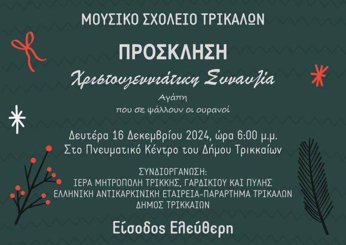 Το Μουσικό Σχολείο Τρικάλων, η Ιερά Μητρόπολη Τρίκκης, Γαρδικίου και Πύλης, η Ελληνική Αντικαρκινική Εταιρεία-Παράρτημα Τρικάλων και ο Δήμος Τρικκαίων σας προσκαλούν στη Χριστουγεννιάτικη συναυλία «Αγάπη που σε ψάλλουν οι ουρανοί». Με κεντρικό άξονα τον Ύμνο της Αγάπης του Αποστόλου Παύλου, οι μαθητές του βυζαντινού χορού, του συνόλου παραδοσιακής μουσικής και της χορωδίας παρουσιάζουν ύμνους και μελωδίες των Χριστουγέννων.