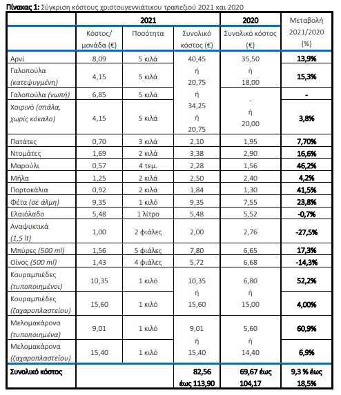 Όπως προκύπτει από στοιχεία του Ινστιτούτου Εμπορίου και Υπηρεσιών της Ελληνικής Συνομοσπονδίας Εμπορίου και Επιχειρηματικότητας (ΙΝΕΜΥ της ΕΣΕΕ), αυξημένες είναι οι τιμές και σε άλλα προϊόντα όπως τα τυποποιημένα μελομακάρονα (+60,9%), οι τυποποιημένοι κουραμπιέδες (+52,2%), το μαρούλι (+46,2%), τα πορτοκάλια (+41,5%) και η φέτα (+23,8%).