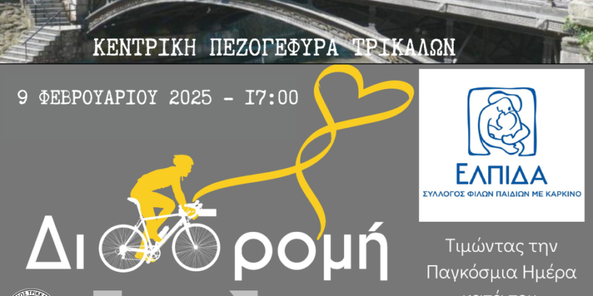 Την Κυριακή 9 Φεβρουαρίου 2025 στις 17:00 ο ποδηλάτης θα βρίσκεται στην κεντρική πεζογέφυρα των Τρικάλων, για να δοθεί το μήνυμα και να συμβάλει στη διάδοση του έργου του Σωματείου «ΕΛΠΙΔΑ – Σύλλογος Φίλων Παιδιών με καρκίνο». Σε μια πόλη με δεκάδες χιλιάδες ποδήλαα, το μήνυμα «κάθε χιλιόμετρο, μια δέσμευση. Κάθε πόλη, μια αγκαλιά. Κάθε στάση, ένα μήνυμα ελπίδας», αποκτά ιδιαίτερη αξία.