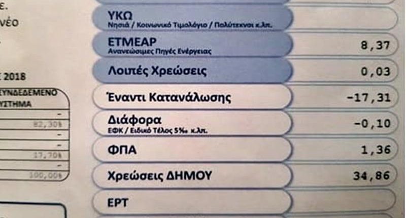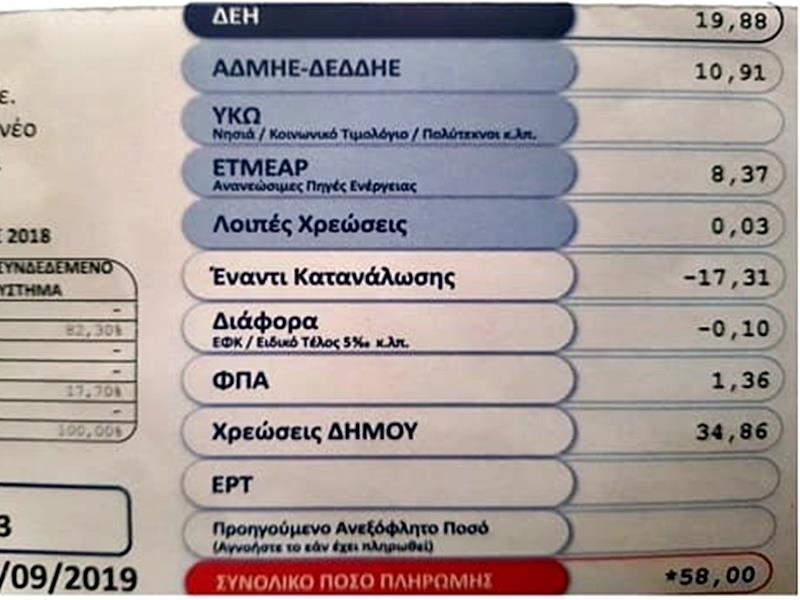 Από τα 58 ευρώ μόλις τα δύο αφορούν στην κατανάλωση ηλεκτρικού ρεύματος καθώς στον λογαριασμό συμψηφίζονται 17 ευρώ από τις γνωστές έναντι χρεώσεις της επιχείρησης.