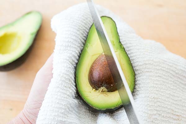 Αφαιρέστε το κουκούτσι: Κόψτε το αβοκάντο οριζόντια στην μέση και με προσοχή χτυπήστε το κουκούτσι με τη λάμα του μαχαιριού μέχρι να κολλήσει. Στρίψτε το μαχαίρι και το κουκούτσι θα βγει εύκολα.