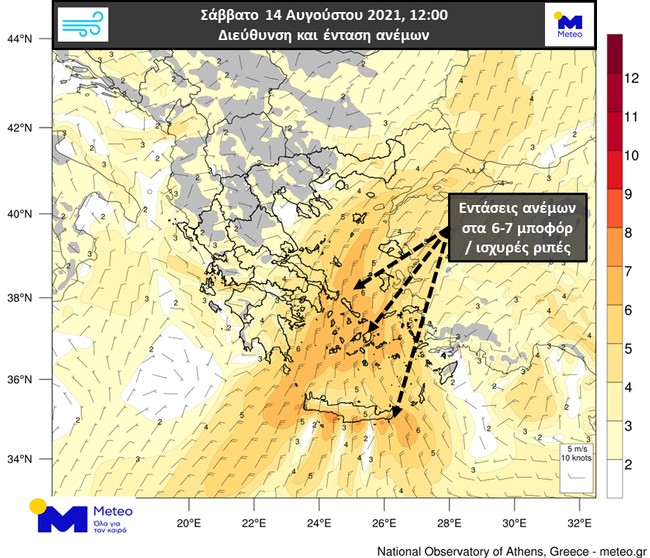 Σύμφωνα με τα προγνωστικά στοιχεία του Εθνικού Αστεροσκοπείου Αθηνών / meteo.gr, το Σάββατο 14/08 οι εντάσεις των βορείων ανέμων στο Αιγαίο θα φτάσουν τα 6 και τοπικά 7 μποφόρ, όπως παρουσιάζεται στον Χάρτη 1, ο οποίος ακολουθεί.