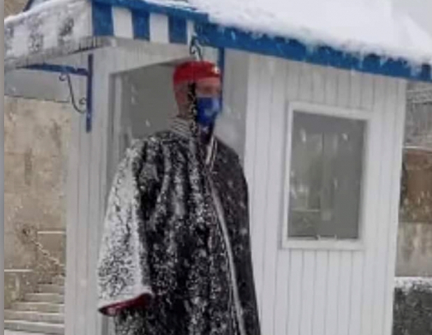 “Η πλατεία Συντάγματος <στολίστηκε> από τις λευκές νιφάδες χιονιού και οι Εύζωνες της προεδρικής φρουράς που χαρακτηρίζονται για το σθένος τους και την αντοχή τους, παρά το τσουχτερό κρύο που τρυπάει κόκκαλα στέκουν αγέρωχοι στο μνημείο του Αγνώστου Στρατιώτη!!!