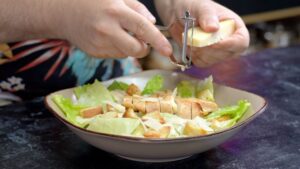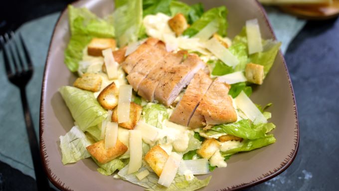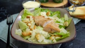 - Σε ένα βαθύ πιάτο σπάμε με τα χέρια μας το μαρούλι ρίχνουμε την ελαφριά σάλτσα, τα κρουτόν, το φιλέτο κοτόπουλο και με ένα πίλνερ κόβουμεσε χοντρές φέτες το τυρί παρμεζάνα.