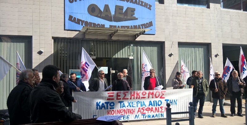 Παράσταση διαμαρτυρίας στον ΟΑΕΕ πραγματοποίησε σήμερα η Γραμματεία Τρικάλων της ΠΑΣΕΒΕ, υλοποιώντας απόφαση που πάρθηκε στη μαζική σύσκεψη εργατικών σωματείων και σωματείων των αυτοαπασχολούμενων την Τρίτη 24 Φλεβάρη στο Εργατικό Κέντρο Τρικάλων.