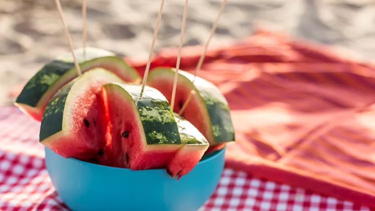 1. Βασικός στόχος σου είναι η καλή ενυδάτωση. Η ανάγκη του οργανισµού σου σε υγρά αυξάνεται όταν περνάς πολλές ώρες εκτεθειµένη σε υψηλές θερµοκρασίες. Μην περιµένεις πρώτα να διψάσεις για να ενυδατωθείς, αφού η πολύωρη έκθεση στον ήλιο, το έντονο κολύµπι και τα παιχνίδια στην παραλία µπορεί να προκαλέσουν πολύ εύκολα –και γρήγορα– αφυδάτωση. Εκτός από την πρόσληψη νερού στη φυσική του µορφή, µην ξεχνάς την ενυδάτωση µέσω τροφών πλούσιων σε νερό (όπως τα φρούτα και τα λαχανικά) και άλλων αφεψηµάτων ή ροφηµάτων.