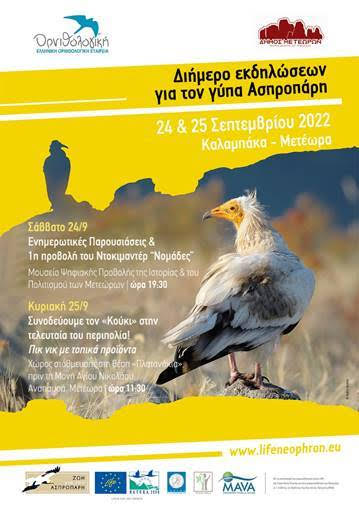 Μετά από πάνω από μία δεκαετία συνεχούς δράσης για τον κρισίμως απειλούμενο με εξαφάνιση γύπα Ασπροπάρη και με αφορμή την ολοκλήρωση, στο τέλος της χρονιάς, του διασυνοριακού Προγράμματος LIFE «ΖΩΗ για τον Ασπροπάρη» που ξεκίνησε το 2017, η Ελληνική ΟΡΝΙΘΟΛΟΓΙΚΗ Εταιρεία θα υλοποιήσει στην περιοχή της Καλαμπάκας ένα διήμερο εκδηλώσεων αφιερωμένο στον γύπα-σύμβολο της φύσης των Μετεώρων και σε όλους τους φίλους και φίλες του κάθε ηλικίας.
