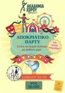 Το Σάββατο 25 Φεβρουαρίου και ώρα 16.00 στον άνετο χώρο του ‘Le Chat Noir’ για δεύτερη μέρα στη σειρά η Ακαδημία Χορού Τρικάλων φοράει την αποκριάτικη στολή της και περιμένει όλους εσάς τους μικρούς χορευτές αλλά και τους φίλους σας καθώς και τους γονείς να ξεφαντώσουμε στο αποκριάτικο πάρτι με παιχνίδια και χορούς να είναι οι κύριες δραστηριότητές! μην χάσετε λοιπόν την ευκαιρία να περάσετε ένα υπέροχο αποκριάτικο Σάββατο γεμάτο κρυφές…. εκπλήξεις .