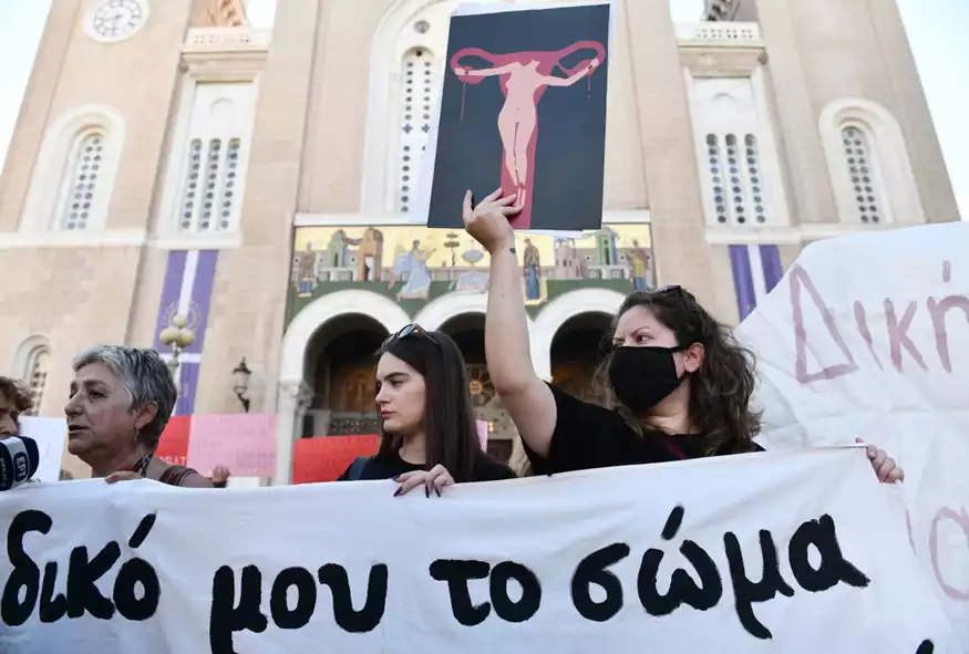 Οι γυναίκες συγκεντρώθηκαν έξω από τη Μητρόπολη από νωρίς το πρωί της Πέμπτης για να εκφράσουν την αντίθεσή τους στην εγκύκλιο κατά των αμβλώσεων. Φώναξαν συνθήματα και σήκωσαν πανό και πλακάτ με συνθήματα για την αυτοδιάθεση του γυναικείου σώματος.