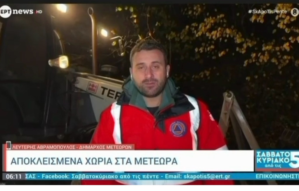 Ο Δήμαρχος Μετεώρων Λευτέρης Αβραμόπουλος εμφανίστηκε στην εκπομπή της ΕΡΤ «Σαββατοκύριακο από τις 5», όπου ενημέρωσε για την εξέλιξη της κακοκαιρίας στα ορεινά του Δήμου και τις δυσκολίες που προκαλεί στις τοπικές κοινότητες. Ανέφερε ότι τα έντονα φαινόμενα συνεχίζονται και απαιτούν συνεχή παρακολούθηση και άμεσες παρεμβάσεις.