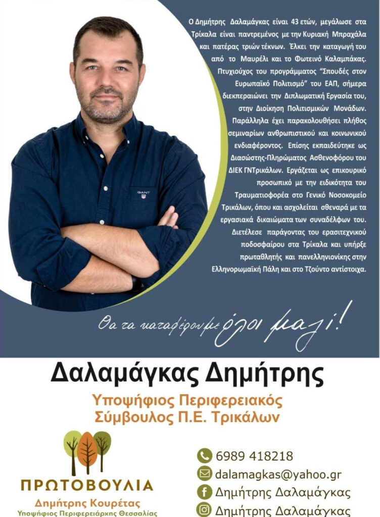 Μια από τις πιο δυναμικές υποψηφιότητες στην Π.Ε Τρικάλων με τ0ν συνδυασμό “Πρωτοβουλία” είναι αυτή του Δημήτρη Δαλαμάγκα.