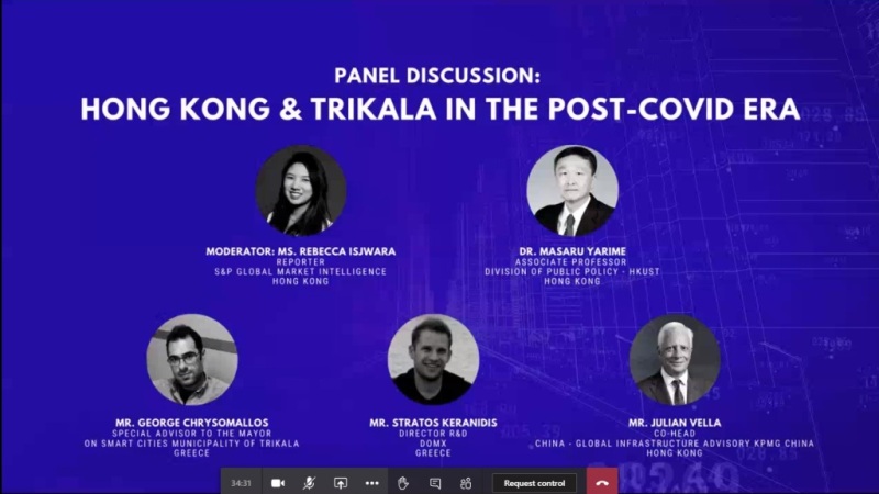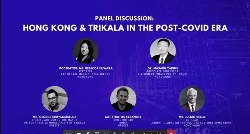 Η πρωτοβουλία τού ελληνικού επιμελητηρίου στην κινεζική μεγαλούπολη, οδήγησε στη σύζευξη των δύο φορέων (Δ. Τρικκαίων και Πανεπιστήμιο στο Χονγκ Κονγκ), ώστε να συζητηθεί, το πώς οι δύο πόλεις χρησιμοποιούν τεχνολογίες smart cities. Ο ακριβής τίτλος της συνάντησης ήταν «Hong Kong & Trikala in the Post-COVID Era», δηλαδή «Το Χονγκ Κονγκ και τα Τρίκαλα στη μετά κορονοϊό εποχή». Σε αυτή τη συζήτηση, μετείχαν οι: